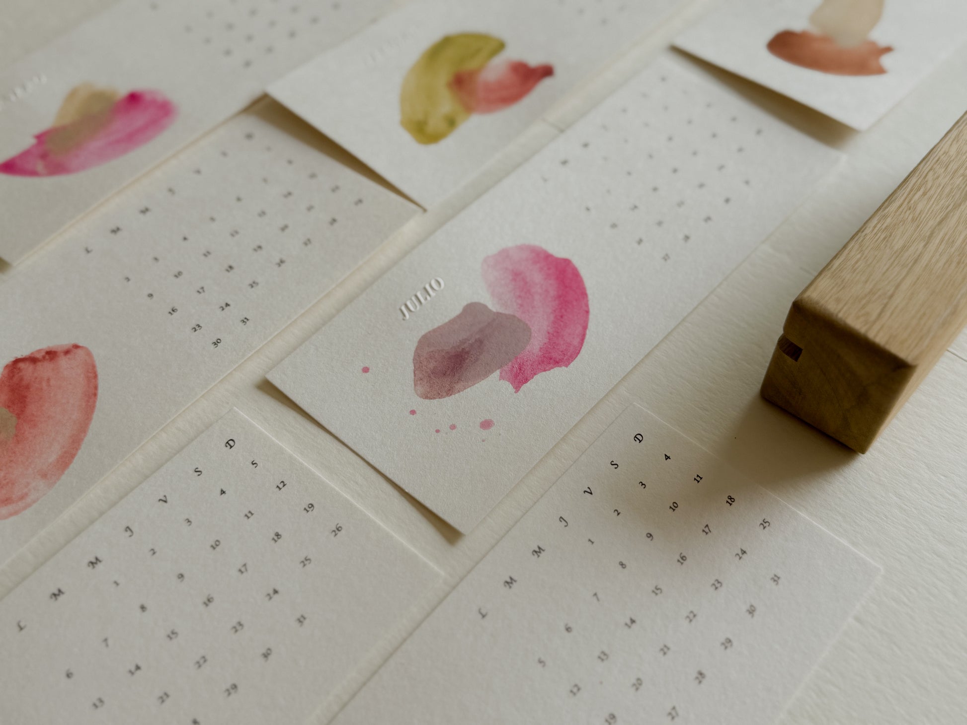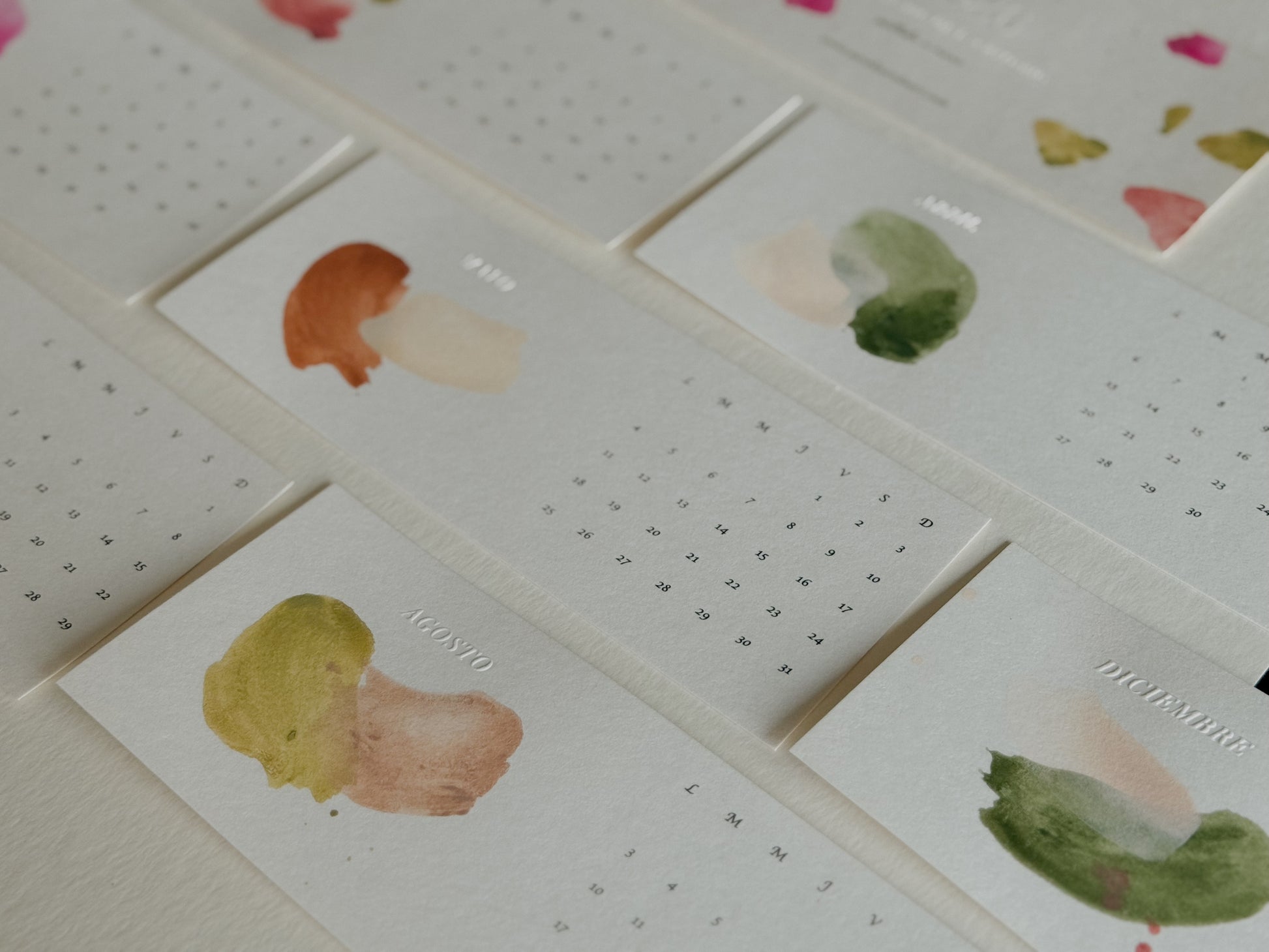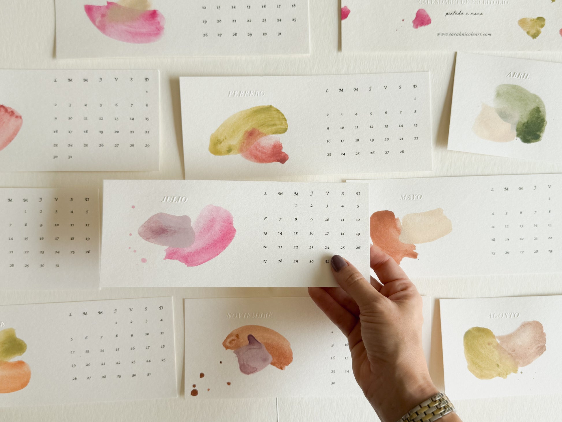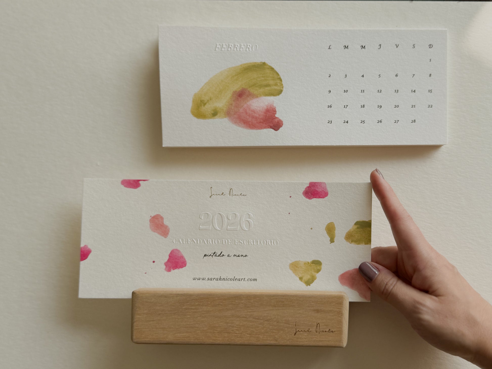 Cada página está impresa en papel de algodón con Letterpress y luego pintada a mano por Sarah Nicole, lo que convierte a cada calendario en una obra irrepetible: ninguno es igual a otro.