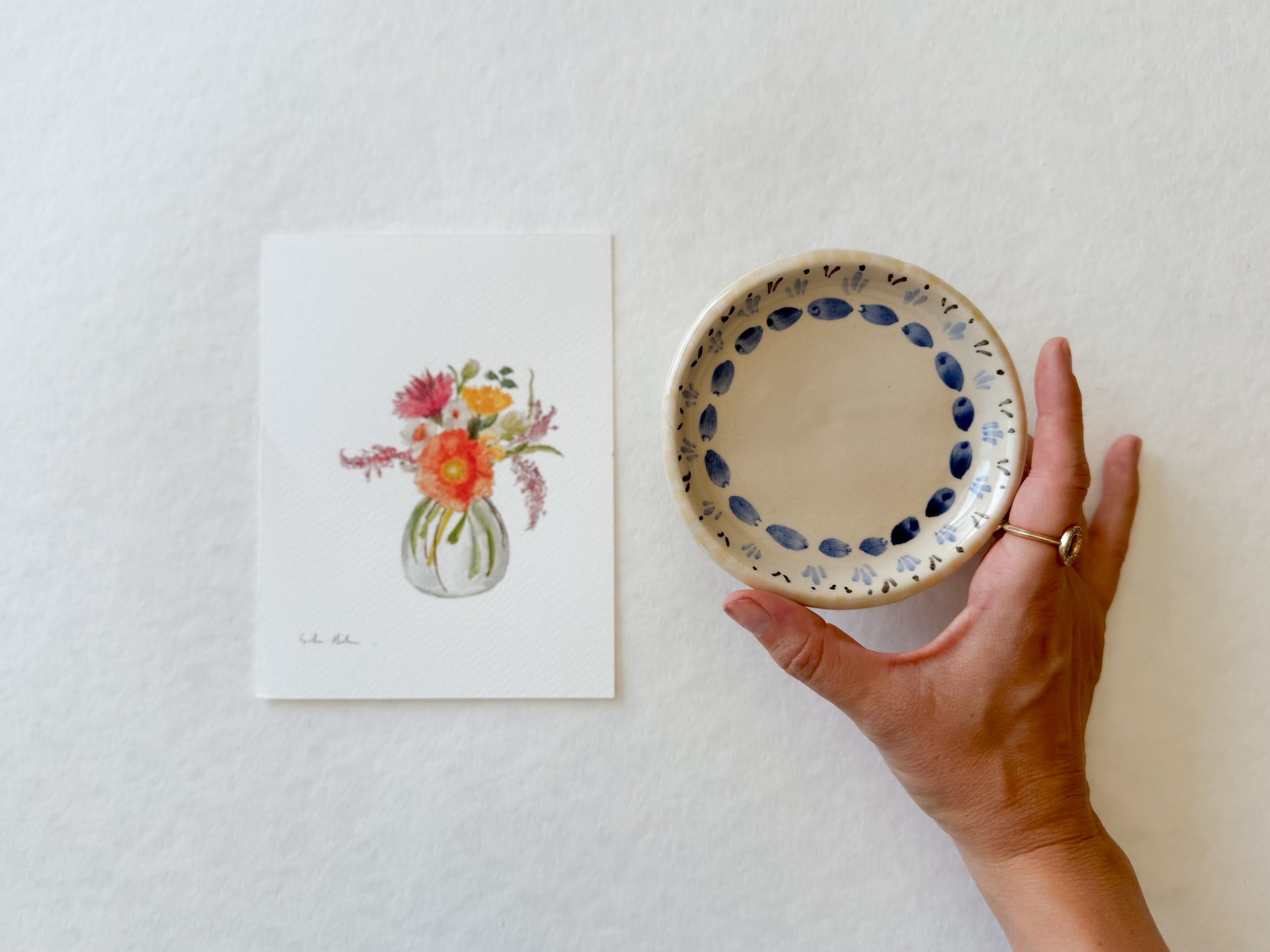 Este set combina arte y funcionalidad en una pieza llena de encanto. Incluye un print (jarrón con flores) y un platito joyero de cerámica pintado a mano, perfecto para colocar anillos, aretes o pequeños tesoros.