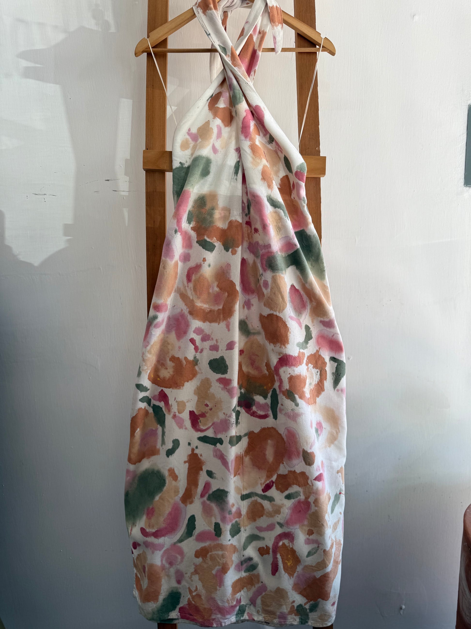 vestido en tela de algodón tipo halter con amarrado cruzado, espalda abierta