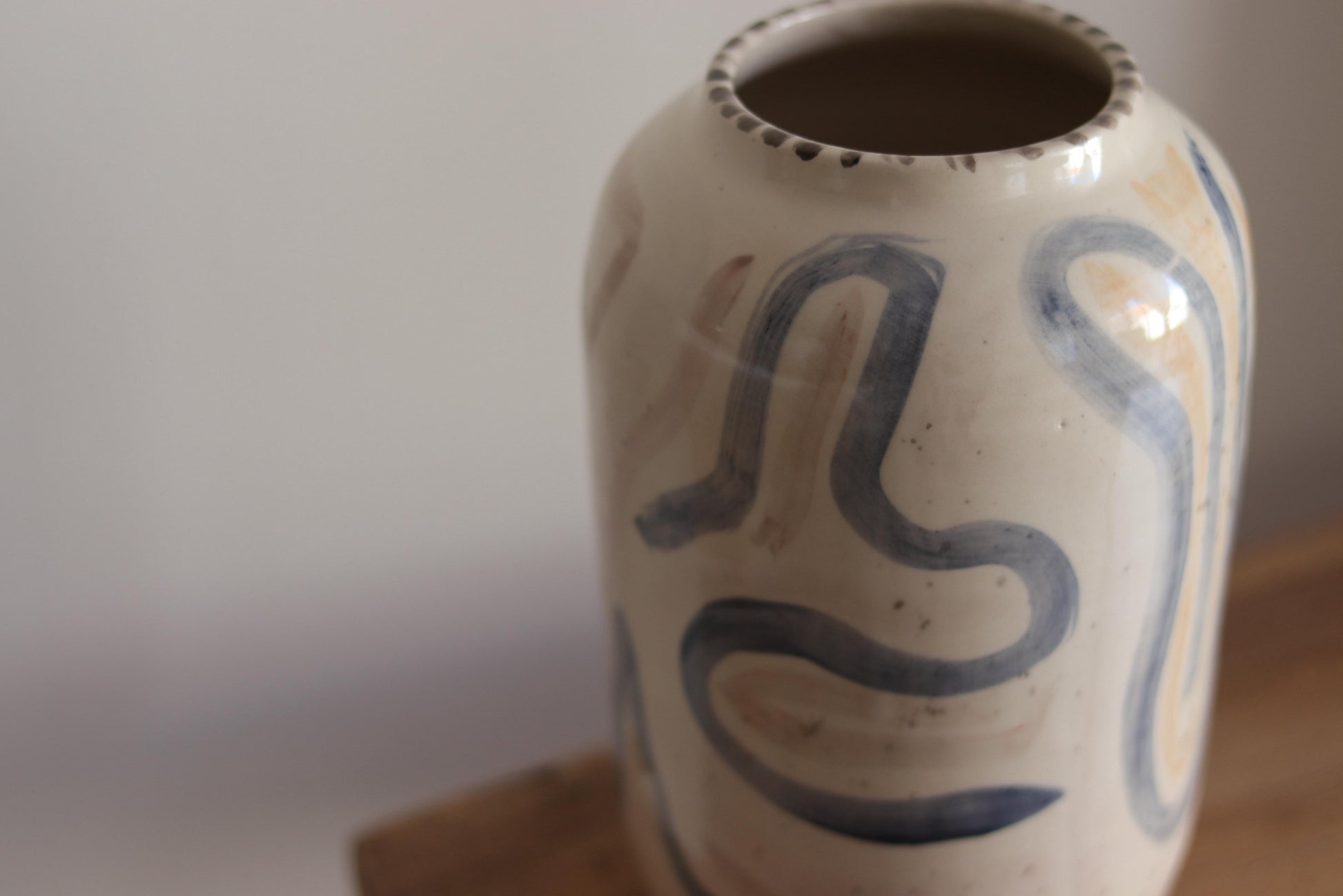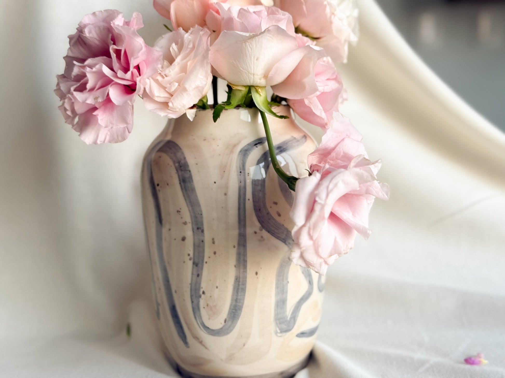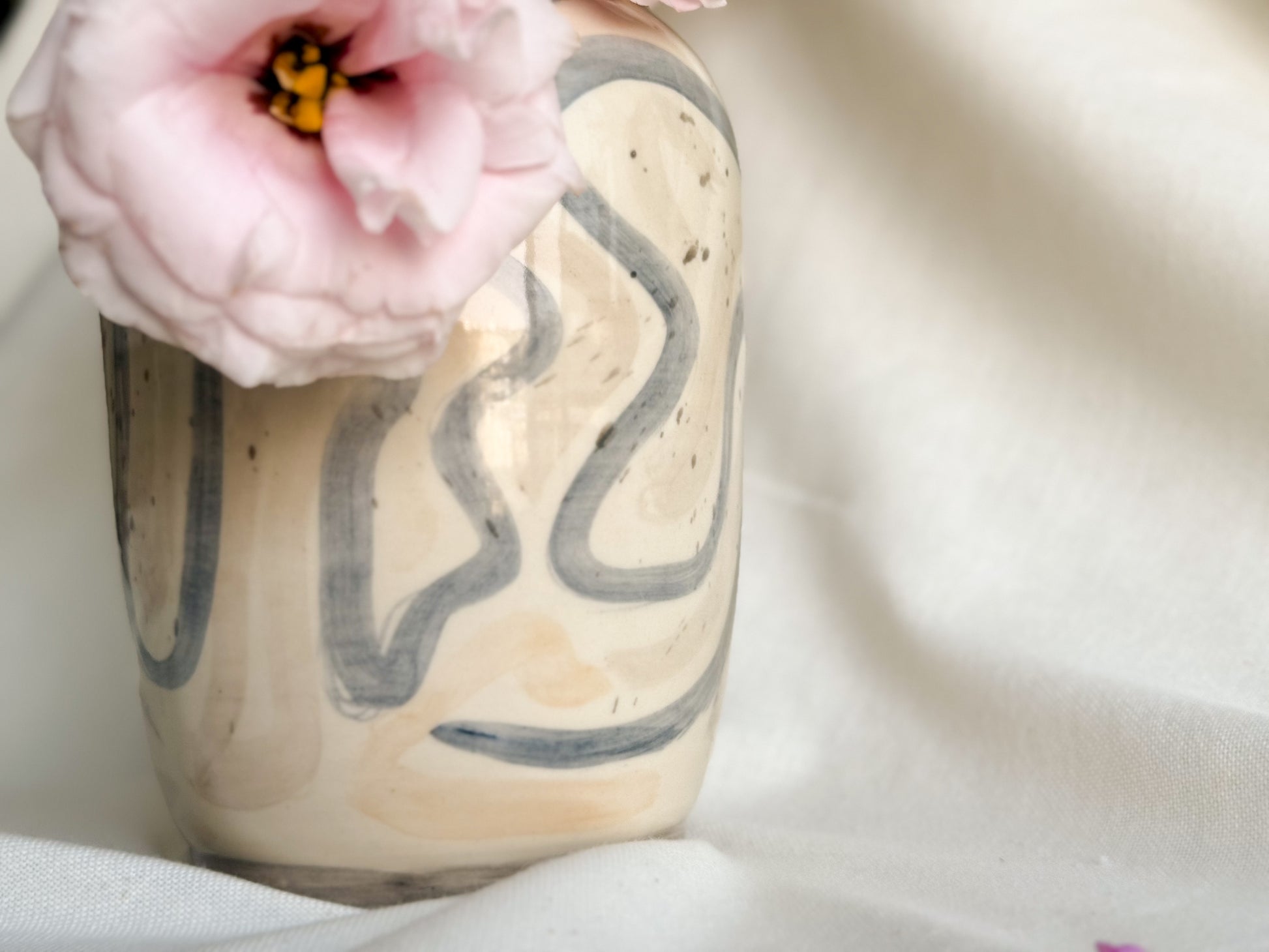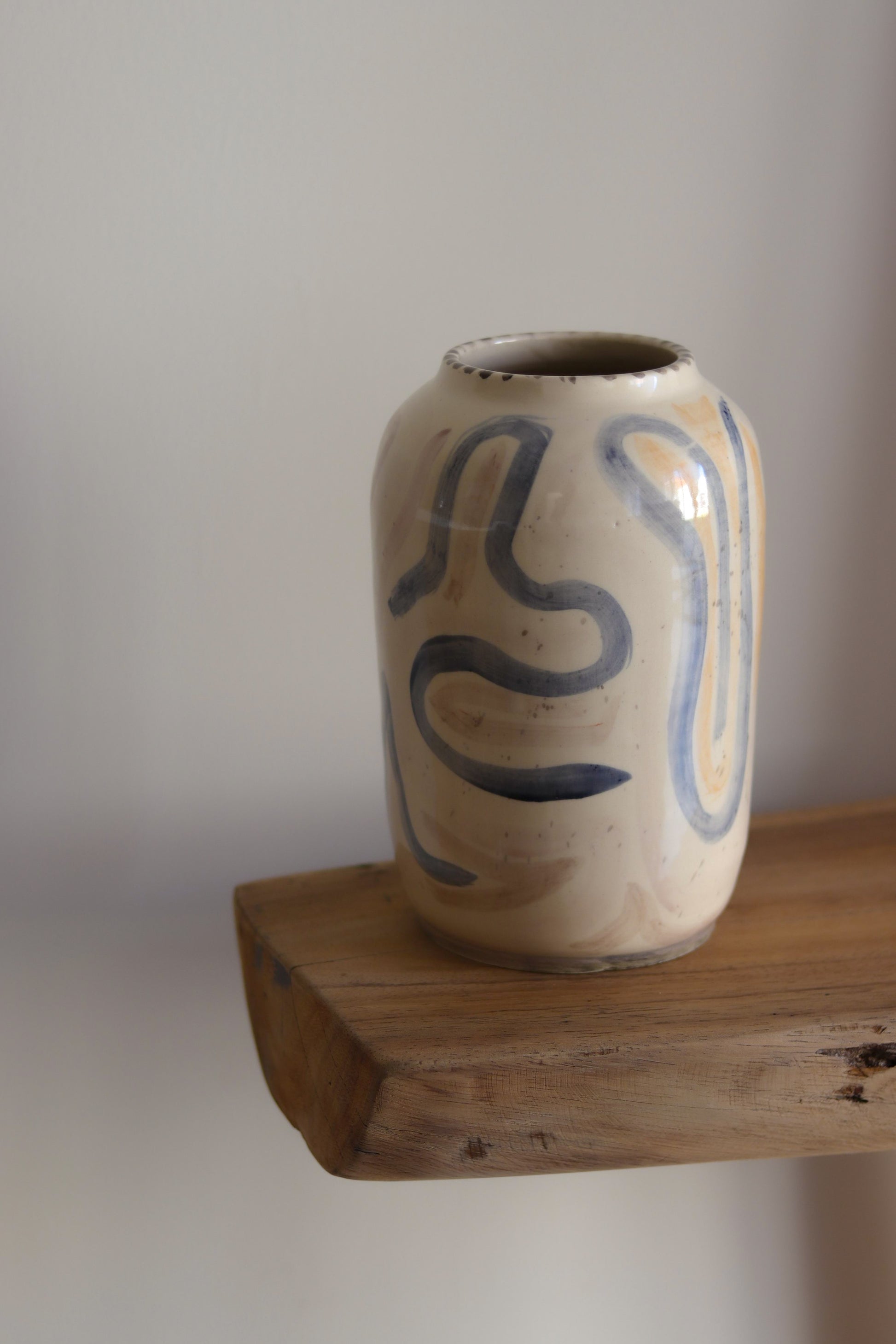 Líneas curvas y fluidas que se entrelazan en un movimiento continuo, simbolizando la conexión entre cuerpo, emoción y espíritu. Una danza abstracta de energía vital. La forma del jarrón evoca a la feminidad.