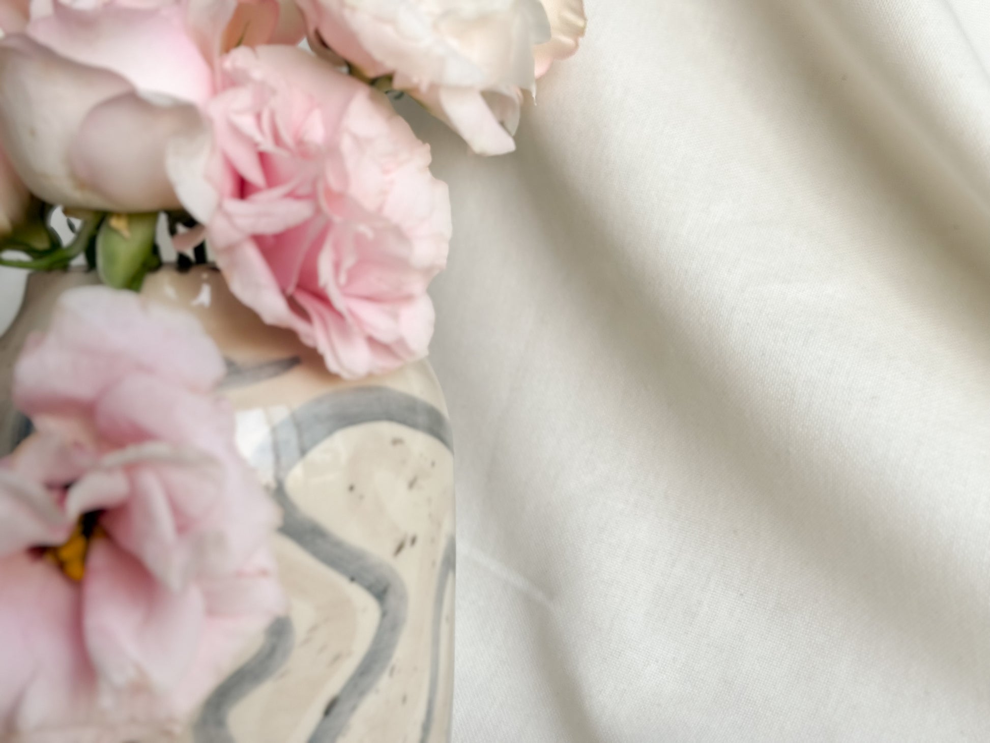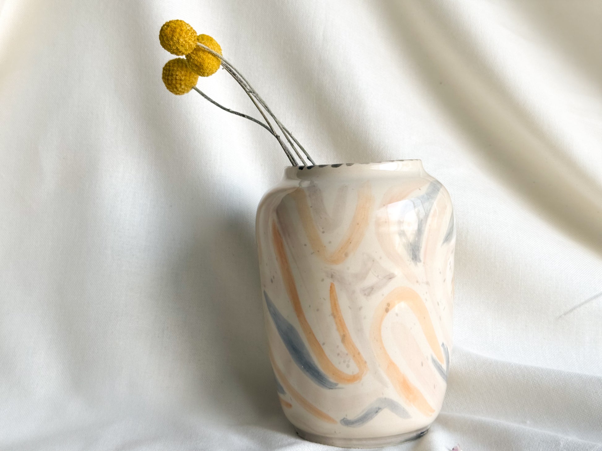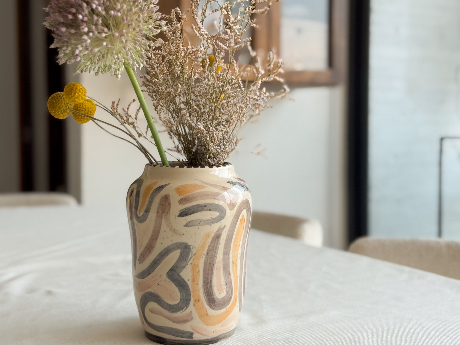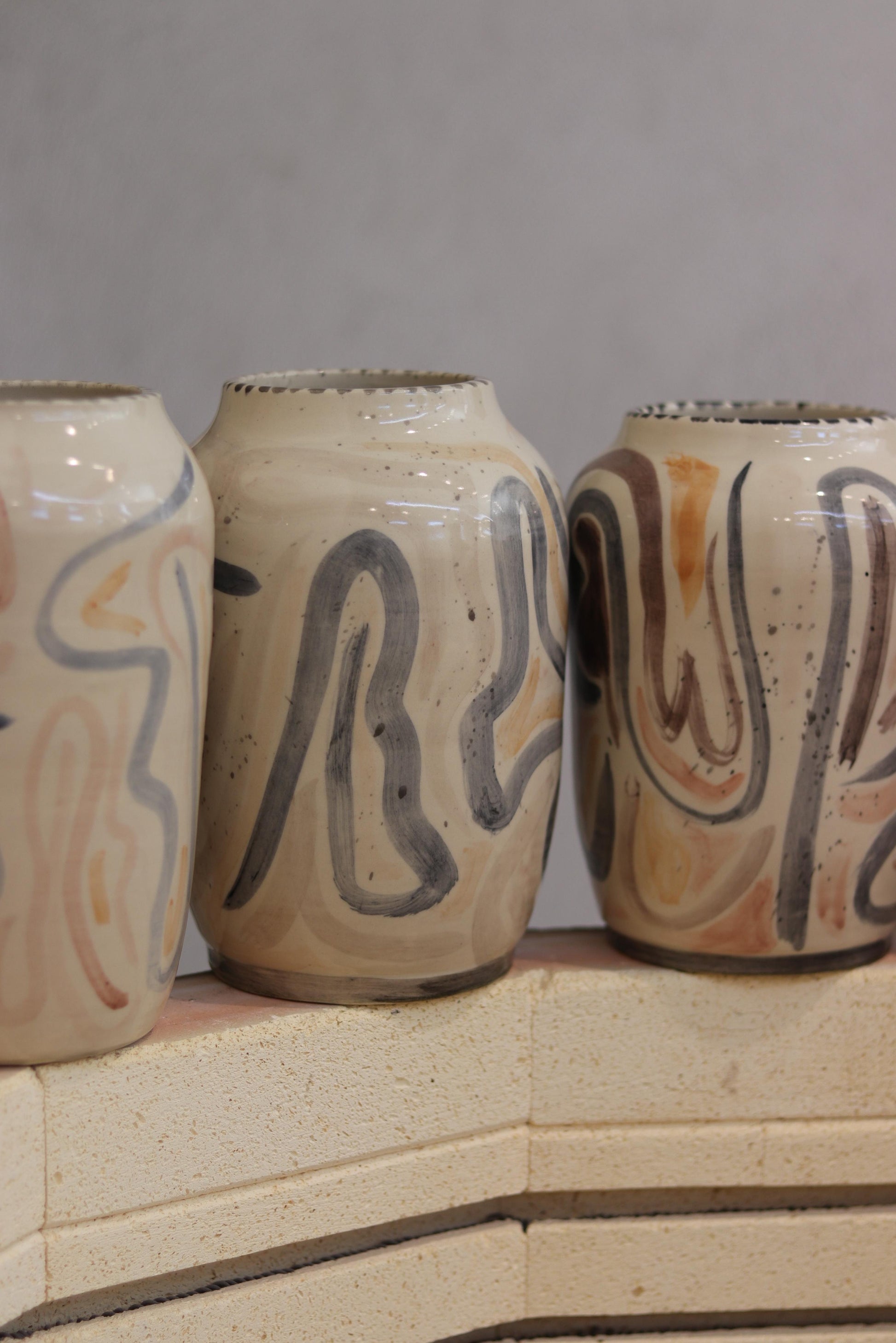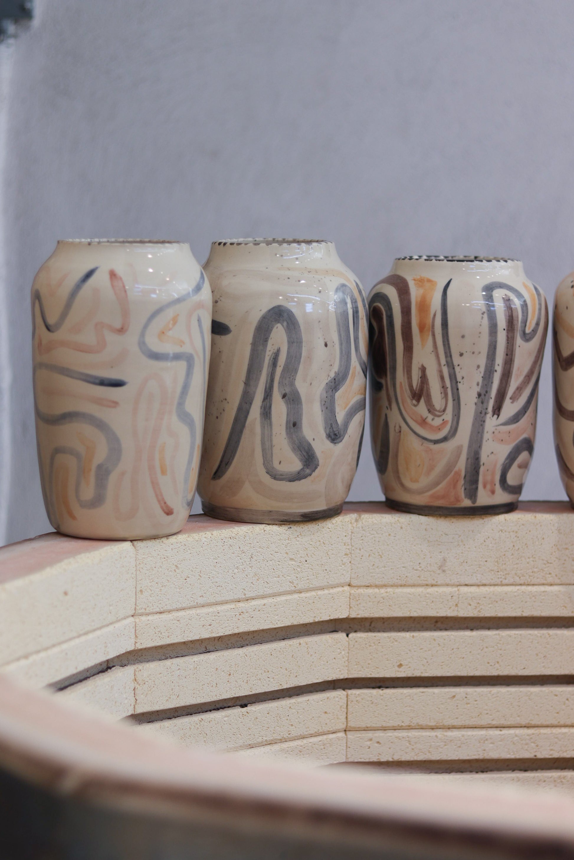 Líneas curvas y fluidas que se entrelazan en un movimiento continuo, simbolizando la conexión entre cuerpo, emoción y espíritu. Una danza abstracta de energía vital. La forma del jarrón evoca a la feminidad.