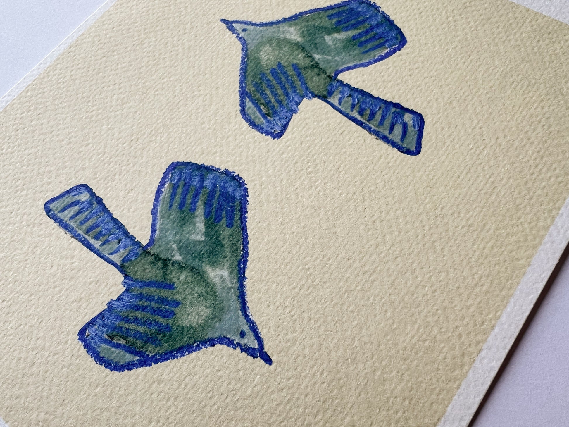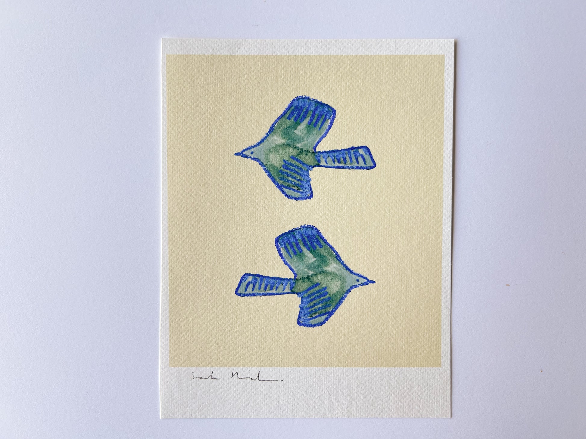 Palomas azules volando sobre un cielo beige, pintado con acuarela y pastel.